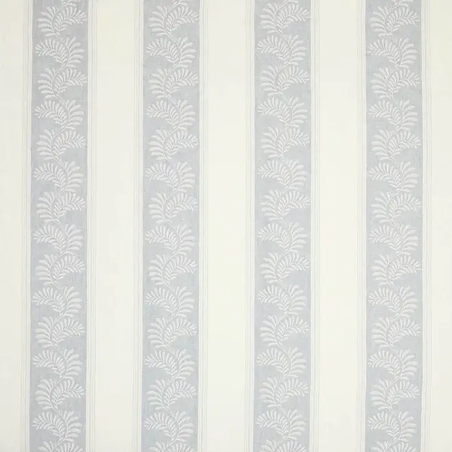 The embroidery of Valora is exquisitely delicate – feathery ferns meander up the centre of woven stripes. The chalky colours of the stripes are beautifully balanced to stay in keeping with the informal character of the design.