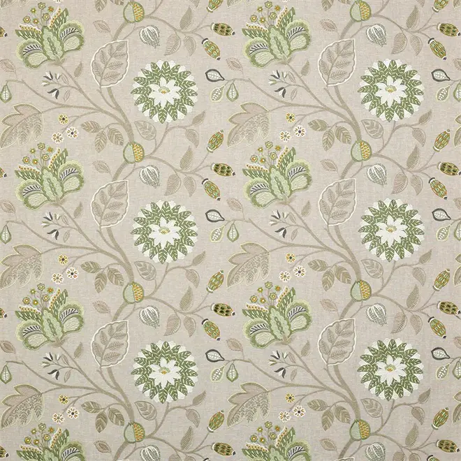 A pleasantly approachable mid scale embroidery featuring stylised flowers and leaves. New colour stories include steely greys with copper highlights on a deep navy ground; a neutral palette is lifted with leafy greens and coral reds look lively on a neutral ground. These colour groups are echoed elsewhere in this year’s collection.
