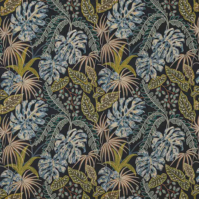 A glorious bouquet of jungle plants combines with a celebration of embroidery techniques to create Rousseau’s layered foliage design. Satin stitchwork in a variety of sizes contrasts against a cotton and linen ground, where rich, jewel like tones play amongst a scene of light and dark.