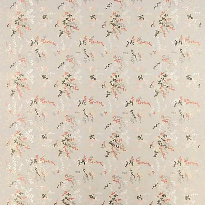 A beautifully feminine pattern featuring sprays of blossom on a softly coloured ground. Again this is a richly layered fabric with a jacquard ground that has highlights of embroidered stitchwork on the flowers. The small blossom branches, some of which have been stitched to add that extra dimension, revealing sprays of colour. Offered in several combinations of colour and also available as a textured wallpaper.