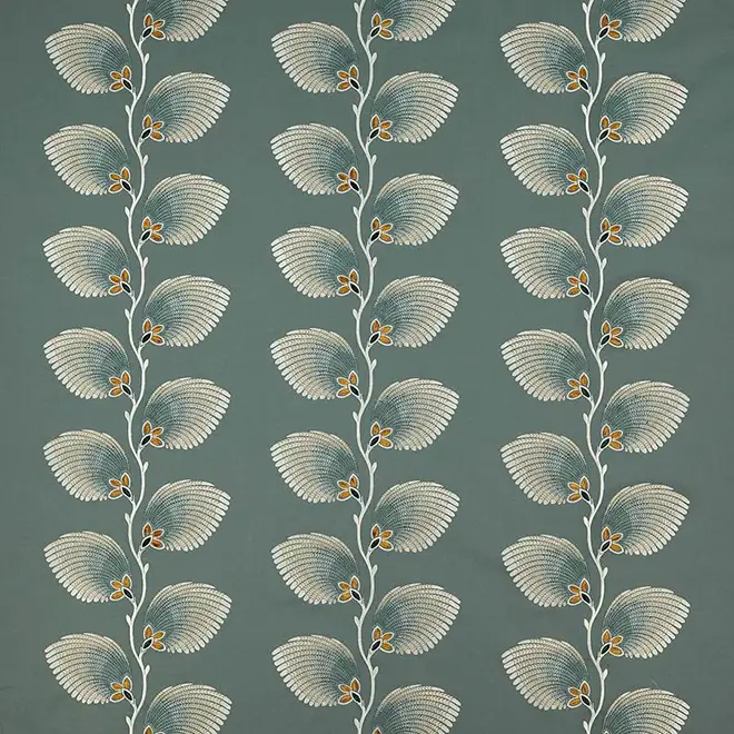 Richly embroidered signature design, featuring sprays of feathered leaves curving from a vertical stem. The decorative effect is enhanced with intricately detailed stitchwork, featuring three dimensional cut areas in a contrasting colour. A broad range of colour stories are available including coral pink with aqua, teal and copper and a range of neutrals.