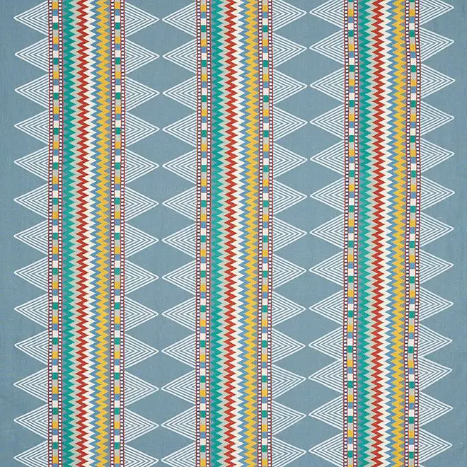 Inspired by the vibrancy of Peruvian textiles, Inka Stripe pairs vivid embroidery with the organic touch of hand block printing. Zig-zag stitches in multicoloured matte yarns are framed by simple printed patterning, creating a dynamic yet artisanal stripe. A striking choice for bold drapery or feature upholstery.