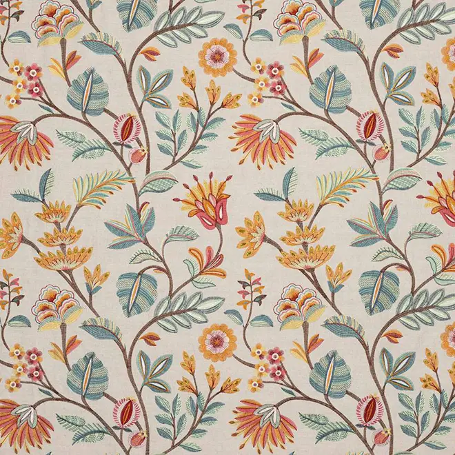 This exuberant floral tree is a modern interpretation of a classic theme. Stunning tropical flowers and leaves are depicted in a dazzling array of stitchwork. A truly signature design, this richly patterned embroidery is enhanced by details of three dimensional hand finished cutwork in colour combinations that are both harmonious and uplifting.