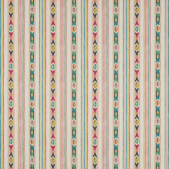 A modern take on the traditional ikat stripe, this exquisitely textured print is enriched by its vibrant popping colour combinations, such as emerald with electric blues or ruby reds with pink, gold and lime. Striking when used in its own right or when layered with other coordinating fabrics.