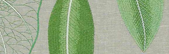 An embroidery of expansive exotic foliage shot through with a denser unbleached filling on a panama linen fabric. It is slubbed, lending the fabric a hand-woven appearance.