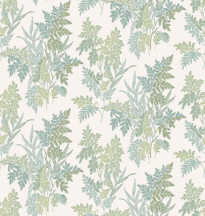 A contemporary print of stylised fern leaves grouped together in blocks of colour.