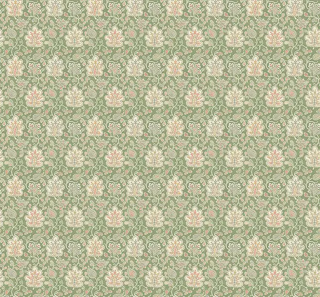Vibrant print of stylised paisley and oak leaf motifs in modern colour combinations.