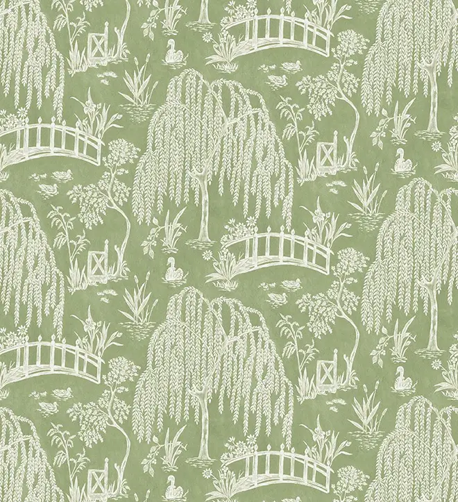 A romantic design of weeping willow trees and an arched bridge over a stream with ducks, swans and reeds, printed in painterly silhouette.