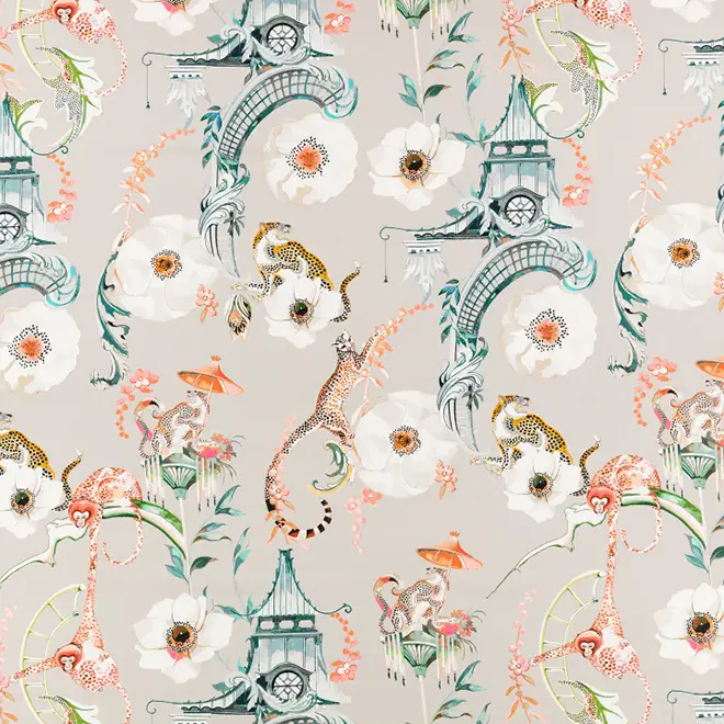 A heady print that tells a story of parasol wielding leopards and mischievous, swinging monkeys in a world of chinoiserie inspired scenes. Euphoria is a utopia of playful expression, giving permission to let go of reality and explore new wonderlands that give free reign to creativity. Inspired by elegant satin gowns from the Temperley archive, this whimsical printed cotton satin captures each intricate detail and subtle nuances of the original, hand-painted artwork, as well as the beautiful intonations of colour.