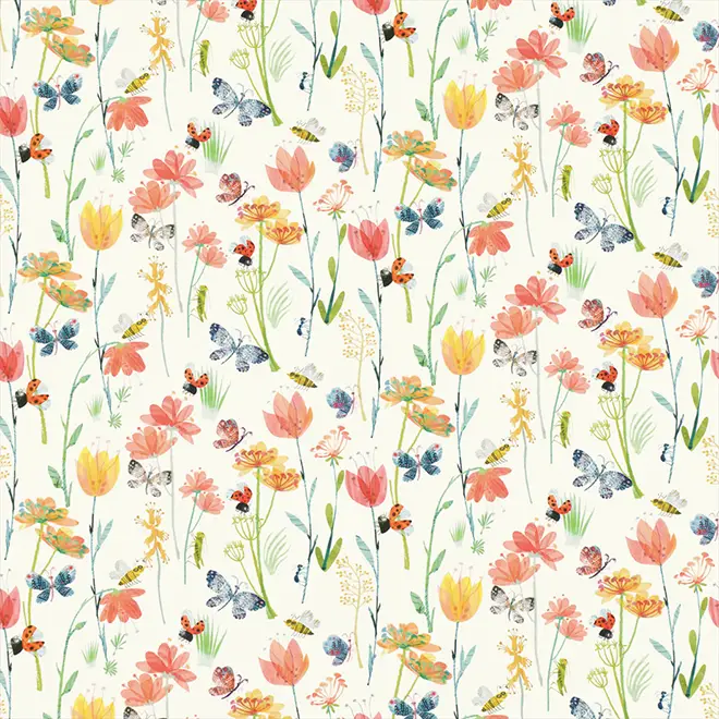 A fascinating and detailed print teeming with life; painterly ladybugs flap their brightly coloured wings, as the butterflies flutter by, whilst jumping grasshoppers and grinning bees dance around blossoming flowers.