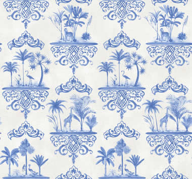 A graceful ‘cartouche’ wallpaper featuring painted scenes of exotic palm trees and animals on a delicate craquelure ground. Drawn from the porcelain and tableware of the eighteenth and nineteenth centuries and available in five striking colourings of rose pink, dove grey, soft charcoal, old olive and cobalt blue.