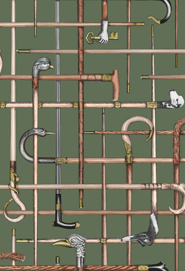 Originating as a silk scarf print from the 1940s, the ‘canes’ of Bastoni reflect the eclectic nature of the house of Fornasetti, brimming with umbrella and hat stands full of antique walking canes. The graphic checkerboard style of the repeat is reminiscent of many Fornasetti favourites, resulting in a striking and bold motif. Bastoni is printed with a gravure four-colour process, to ensure all details remain sharp, with flecks of tonal metallic detail added in a luxurious gold. Choose from three classic colourways of Cream, Racing Car Green, and Charcoal.