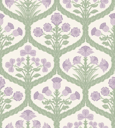 Taking its inspiration from Gothic Revival design, Floral Kingdom is a softer ogee design made of knotted leaves and each of the United Kingdom’s national flowers: spring time daffodils for Wales, fragrant roses for England, the bursting rosettes of the Scottish thistle, and the delicate shamrock sprig representing Northern Ireland. Choose from elegant colour palettes in soft botanical hues of Ballet Slipper & Leaf Green on Forest; Rose & Forest on Charcoal; Lilac & Teal on Denim; and Mulberry & Olive Green on Parchment.