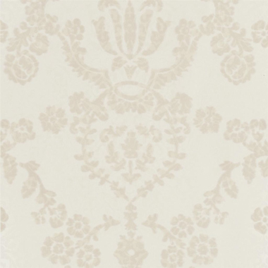 A distinguished flock wallpaper with a very layered, hand-printed feel. The antiqued damask paste print ground sits beneath the ornate flock stencil as graceful as lace. On non-woven ground for easy hanging.
